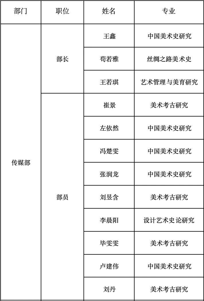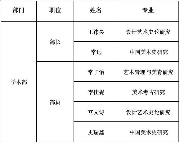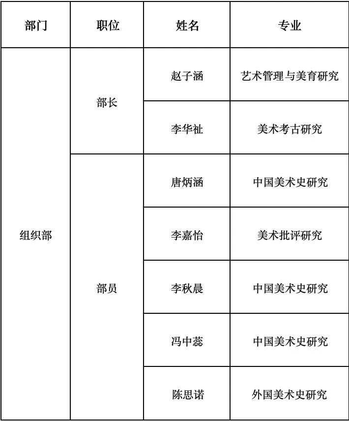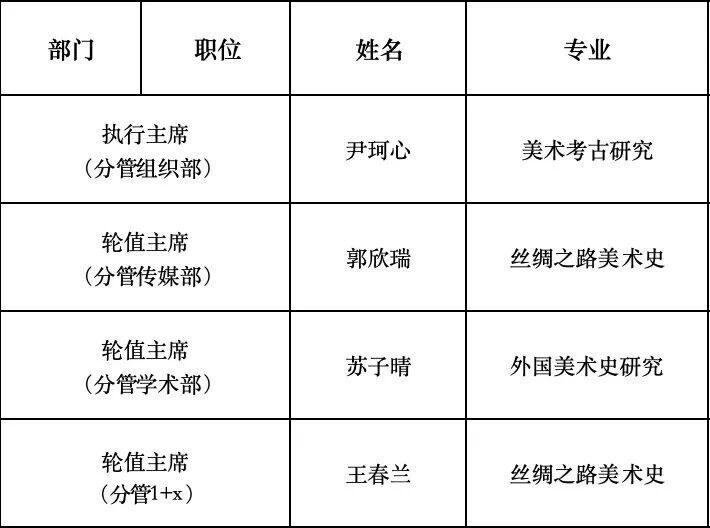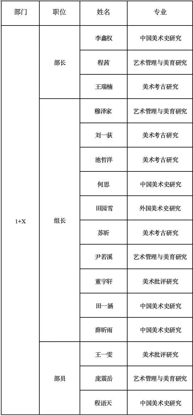 目前,艺术人文学院研究生发展协会由组织部、传媒部、学术部及起予者:“1+X”本硕优培计划四个主要部门组成。