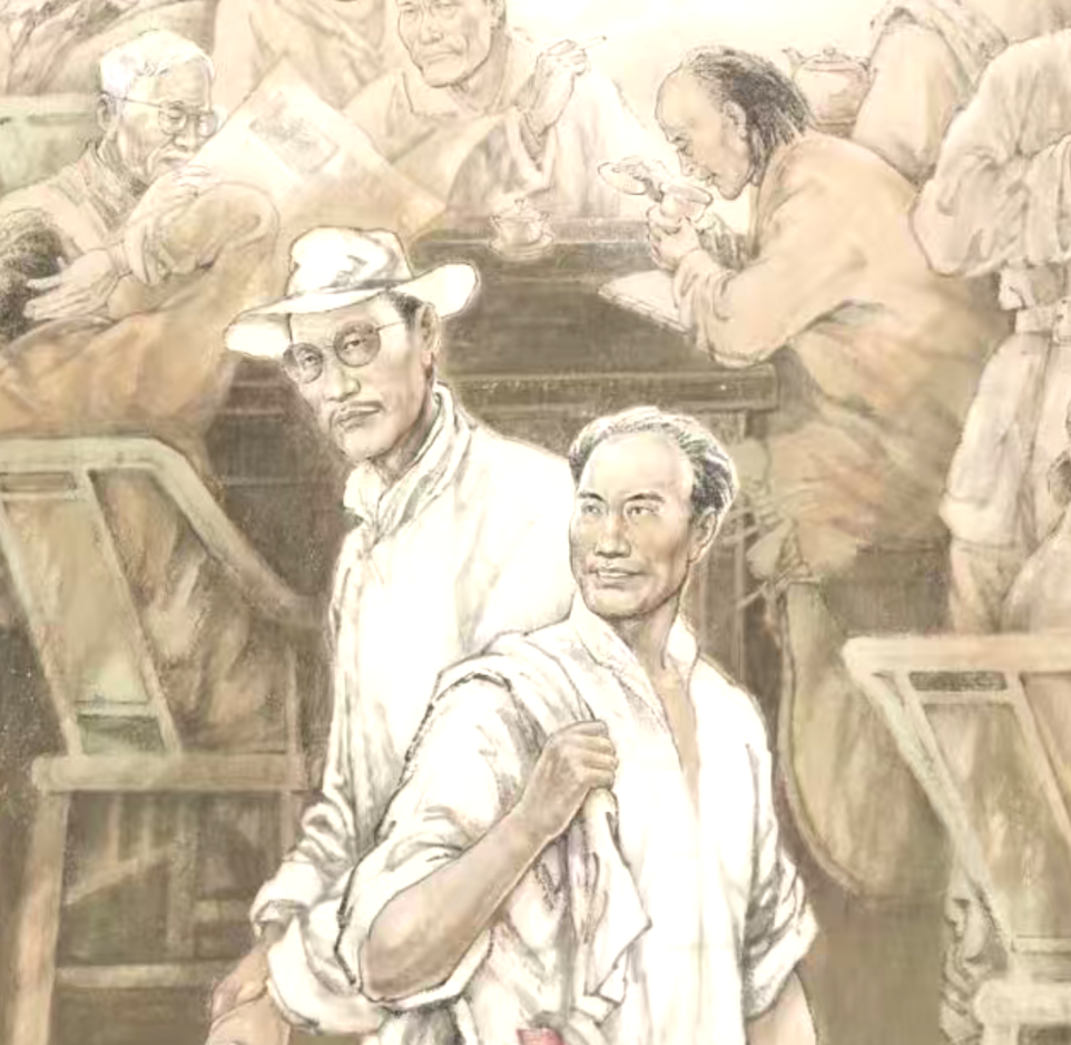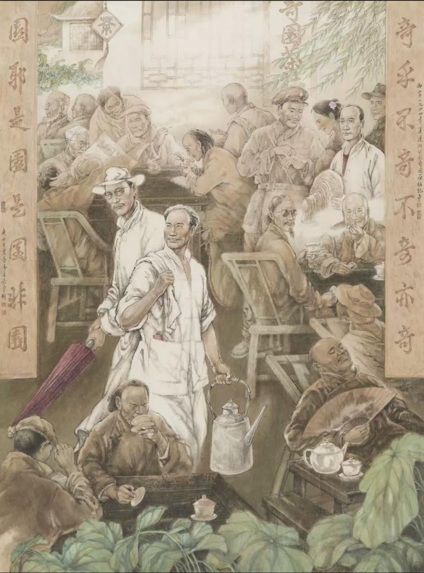 为凸显王释奇、梅永和两位主要人物,作者凭借绘画语言,运用仿古做旧手法,按照黄金分割法设置梅永和在画面中央。梅永和一副跑堂掌柜的打扮:身穿短衫,右肩搭毛巾,左手提着大水壶;眼光敏锐机智,招呼着八方来客;神态老练,开朗豁达。身后是茶社经理王释奇,典型的民国知识分子装扮:身穿长袍头戴礼帽,脸上一副老式黑眼镜,沉稳睿智而坚定。王释奇手拿一把伞,寓意着抵御风暴的来临和保护地下党的重任。