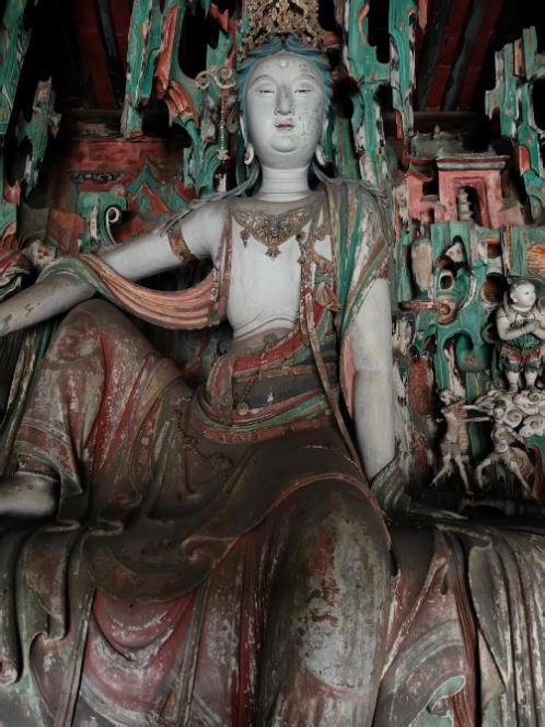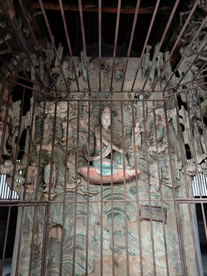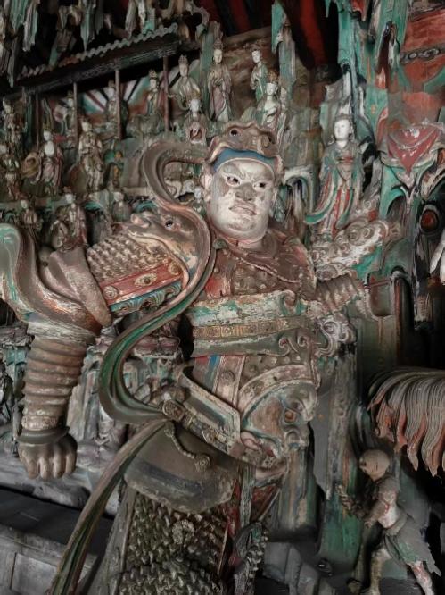 现存明代彩塑五百余尊,主像自在观音和韦驮像生动逼真,四周悬塑和窗下供养人像组合起伏,富有生动情趣。其中韦陀像为双林寺镇寺之宝,从头部到腰腹再到腿部形成流畅曲线,配合飘带飞扬的动态,打破静态雕塑的沉闷。它眼神反向凝视,面部神态威严中带着灵动,刚劲的铠甲与飘逸的衣袂形成“刚柔并济”的反差美。