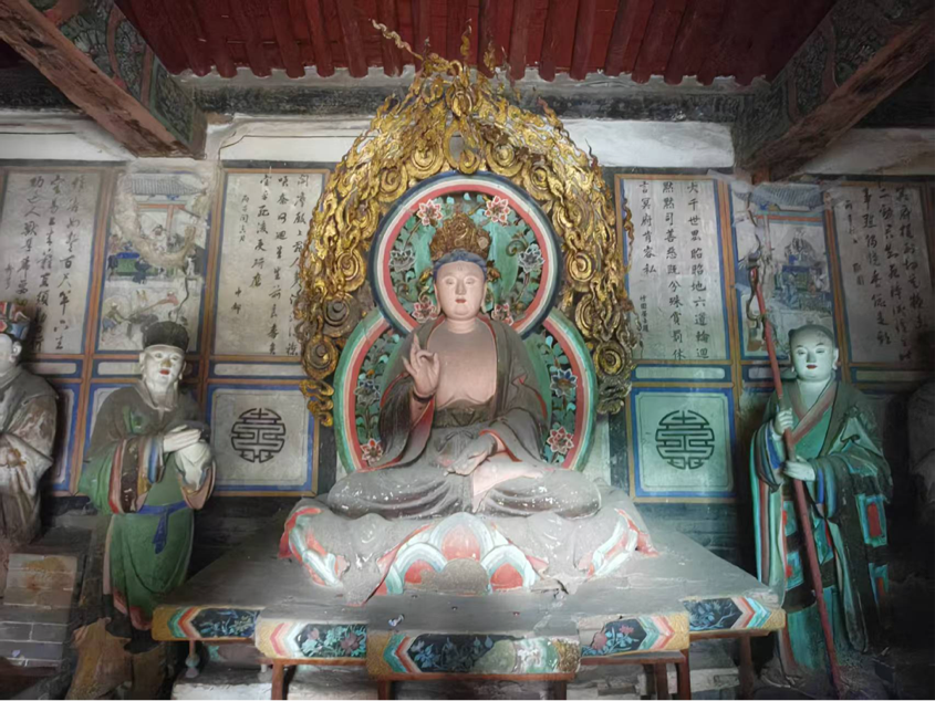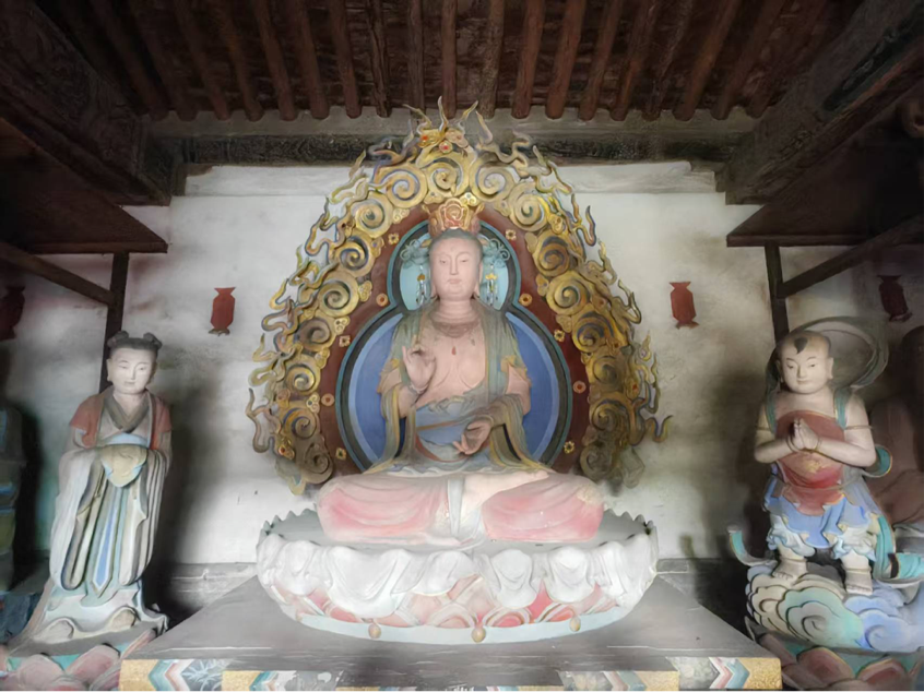 第三座殿—观音殿与地藏殿相对,同位于后院,内部有观音菩萨塑像,观音盘坐于莲花台之上,供奉童子各位于两侧,雕像服饰精美典雅,栩栩如生,衣袖宛若流水一般生动。