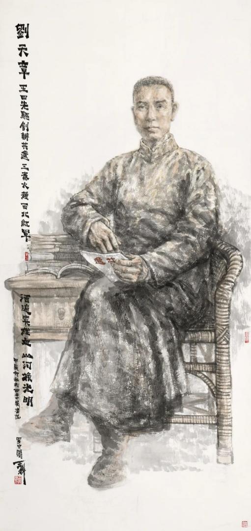 画家王犇以水墨写意虚实笔法,据刘天章遗照绘其正襟危坐、浩气凛然之姿,背景融入《秦钟》《共进》刊物影像。作品以环绕式叙事联结其精神与西北革命火种,人物风骨与油灯意象呼应,凸显开拓担当;水墨为主、淡彩为辅,墨色对比突出人物,晕染强化历史感。作为 “双百” 精品,该作以艺术还原历史、传递爱国精神,是初心教育的生动素材。