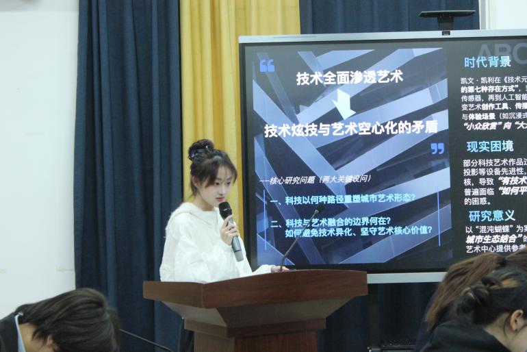 刘诗韵同学分享的内容为《文化与科技融合视域下的城市艺术生态重塑一一以长安云安城市艺术中心"混沌蝴蝶"科技艺术季为例》: