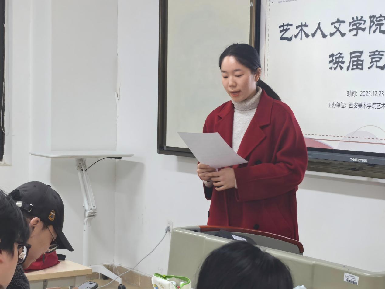 薪火赓续,踔厉新程。为进一步锻造高素质学生干部队伍,保障工作的连贯性,持续发挥学院研究生发展协会服务学院、联结同学的枢纽作用,西安美术学院艺术人文学院研究生发展协会于2025年12月23日顺利召开换届选举大会。本次选举通过提交材料、个人宣讲、现场答辩等规范环节,严守公平公正准则,择优选拔人才。