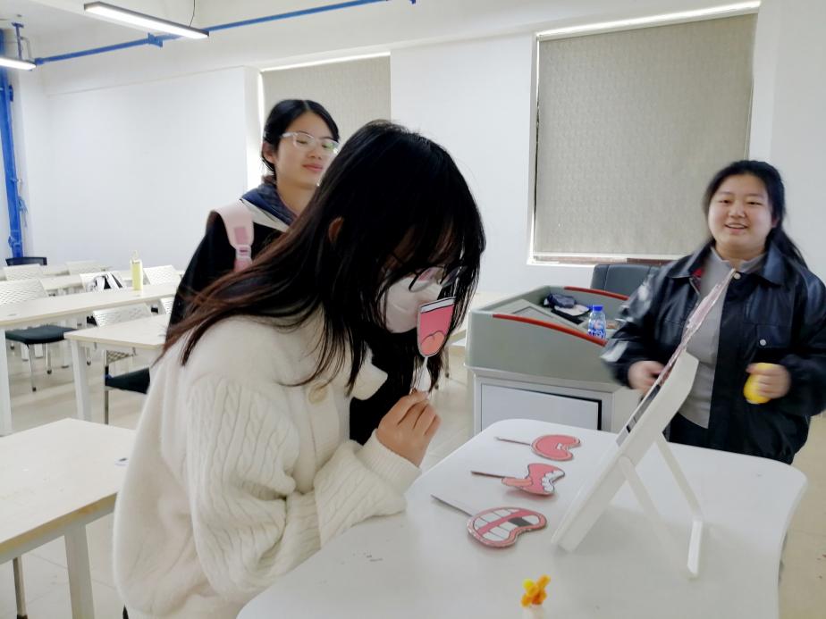 最后的趣味体验环节,“哈哈笑脸镜”装置将氛围推向高潮。团员们对着镜子模仿笑脸,夸张的表情、爽朗的笑声瞬间驱散了课堂的严肃感,大家在轻松互动中真切感受到:原来情绪调节可以如此有趣,一个简单的微笑,就能成为对抗内耗的有力武器。