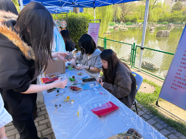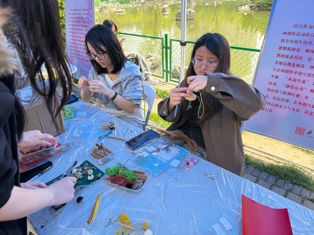 活动当天,明湖湖畔春意盎然。长桌整齐排列,树皮、干花、松果、柠檬片等自然素材琳琅满目,摆放有序。湖畔的微风与自然的肌理相映成趣,为同学们营造了一个远离喧嚣、沉浸创作的静谧空间。