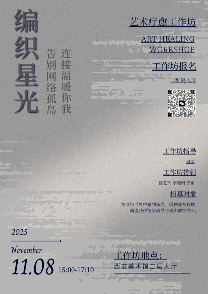 在AI算法深度嵌入日常生活,数字情绪悄然累积的当下,如何安放我们疲惫的心灵?2025年11月8日下午,在西安美术馆二层公共空间,“编织星光:告别网络孤岛,连接温暖你我”艺术疗愈工作坊如期展开。参与者们共同遵守“不评价、不分析、不建议”的团体约定,开启了一场从“孤岛”走向“联结”的内在旅程。