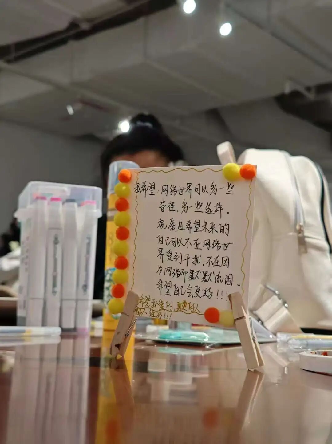 在舒缓的音乐中,参与者闭目冥想,想象漫步于阳光草地。随后,大家匿名在“情绪便签”上写下反映内心真实的词语或句子,投入中央的“情绪池”,完成一次无声的情绪托付。