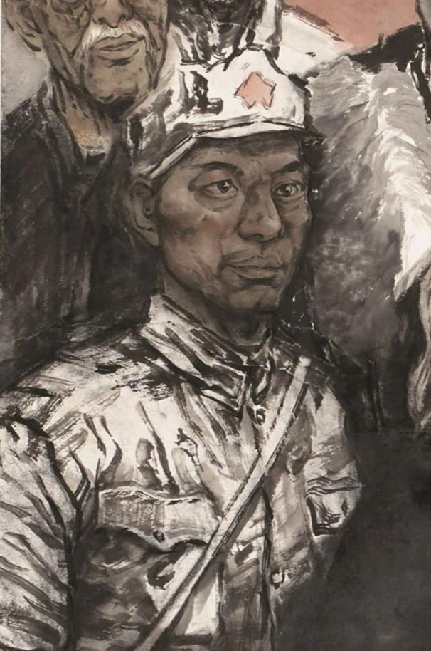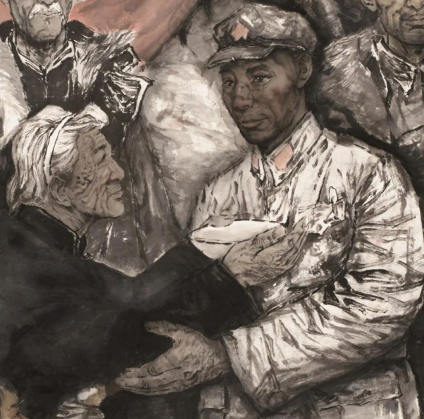其二,人物塑造:主体部分安排一位年长的老人为时任二十五军政委吴焕先端水的场景(图2);体现了军民和谐、百姓拥戴红军战士的主题。身后的徐海东已然被这一场景深深地感染,他神情触动,热泪盈眶,眼神中不失柔情与坚毅(图3)。生动诠释“人民军队为人民,人民拥护子弟兵”的深刻内涵,让红二十五军忠诚为民、群众衷心拥护的精神具象化。