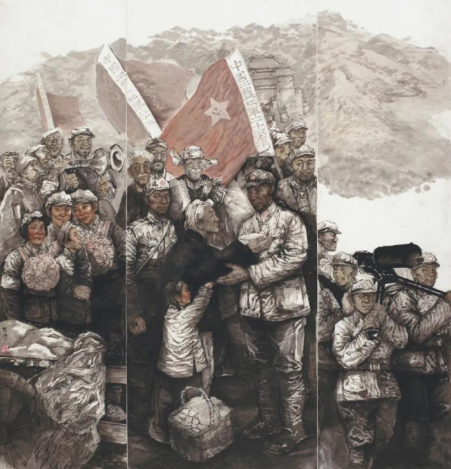 其一,构图与形式:《红二十五军葛牌》作品采用群像组合构图,将红二十五军战士、葛牌镇群众等不同身份人物汇聚于画面。背景融入秦岭山脉、葛牌镇街巷轮廓,既点明地理环境,又以雄浑山水烘托革命的壮阔底色,让观者直观感受红二十五军战斗与生活场景,构建出沉浸式历史空间。(图1)