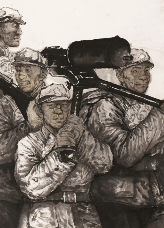 其三,主题表达:作品右侧一联是三位健壮的战士扛着重机枪,有人目光坚定,也有人回头瞭望,依依不舍,战士回头的动作则呼应了画面的中间部分(图4)。作品的构图、内容无不体现出长征精神中“紧紧依靠人民群众,同人民群众生死相依、患难与共、艰苦奋斗”的精神与作者对革命理想的向往和对美好生活的希望。
