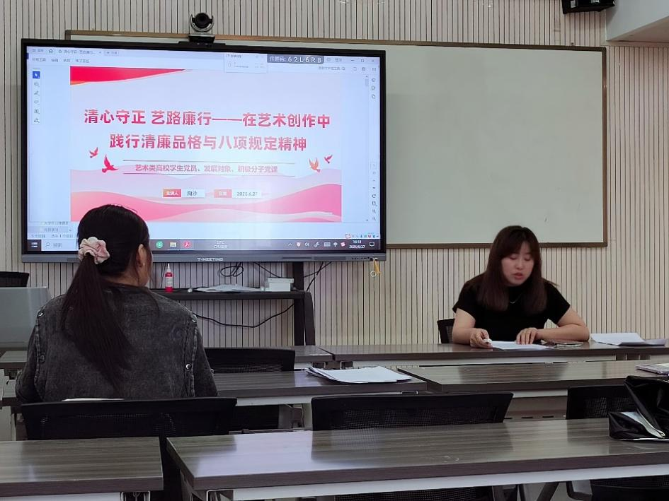 会议第二项由陶沙以《清心守正,艺路廉行——在艺术创作中践行清廉品格与八规定精神》为题开展主题讲授,启示学生党员只有把外部的条例要求转化为内部的自觉要求,由他律转向自律,才能让清廉成为艺术人生最亮的底色。随后,她指出艺术追求自由表达,而清廉强调纪律约束,二者看似对立,实则统一于“以艺载道、以艺弘德”的崇高追求中。真正的艺术家应胸怀家国、心系人民,将清廉品格融入创作灵魂,让艺术成为传递正气的精神火炬。通过开展深入贯彻中央八项规定精神学习教育与艺术创作关联的深入剖析,在场党员对“艺术为人民服务”的宗旨有了更具象的理解。最后,陶沙落脚到青年艺术学子的“清廉守正”的行动上,指引学生党员在思想上筑牢信仰之基,在创作上扎根生活沃土,行为上严守纪律底线,网络上传播正向能量,才能不负时代、不负人民。