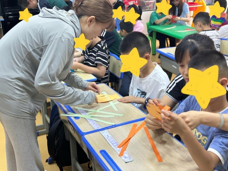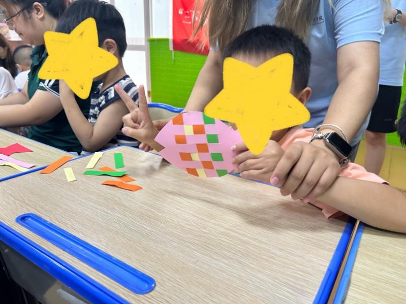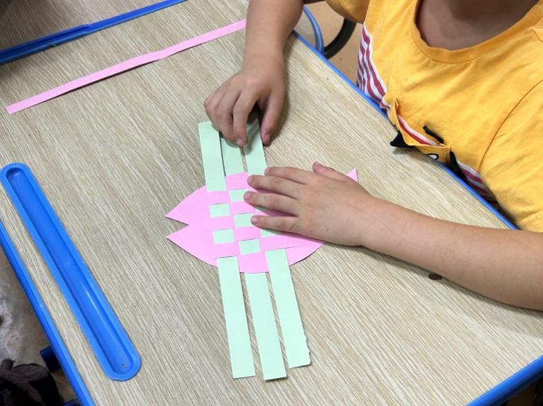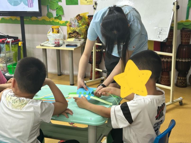 在实践之前,队员们向孩子们做示范,让他们了解、熟悉流程。活动开始,孩子们挑选了五颜六色的纸条,开始了他们的纸编之旅。尽管手法略显生涩,但每一双小手都充满了热情与专注。